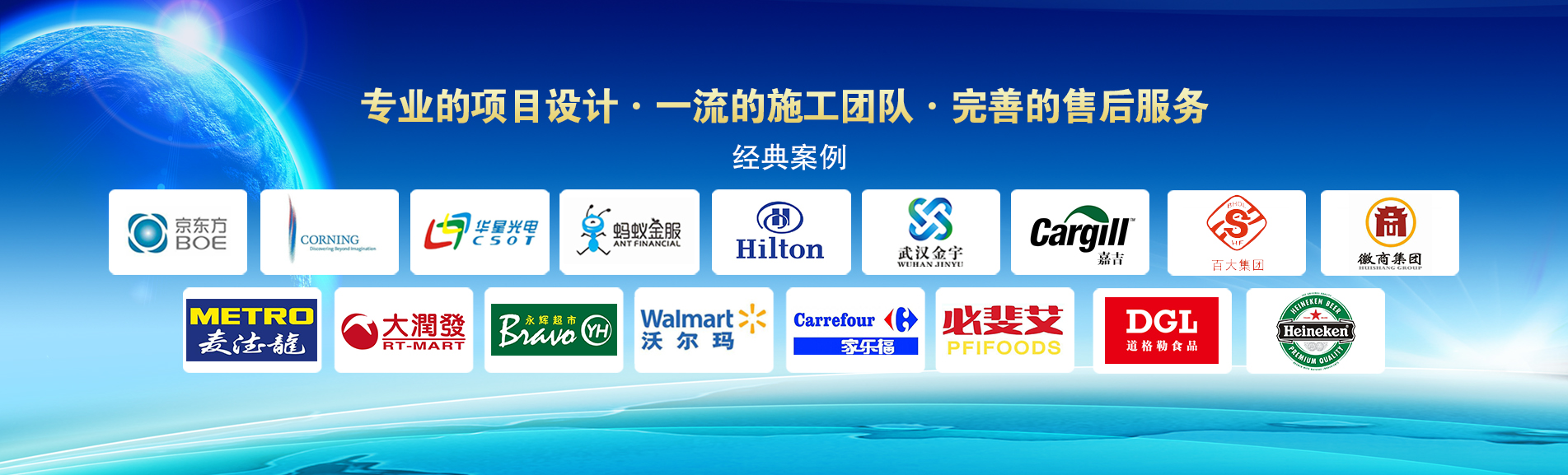 冷凍冷藏設(shè)備大型冷庫項目: 武漢中百物流冷庫(40000㎡)、蘇州、北京普洛斯大型物流庫(17000㎡)、沈陽佳德物流冷庫(20000㎡)、上海東航配餐物流庫(6000㎡)、杭州華商勾莊物流冷庫(24000㎡)、安徽安心蔬菜綠色食品冷庫(12000㎡)、武漢金宇冷庫(35000㎡)、必斐艾食品廠(14000㎡)、中國-東盟(百色)農(nóng)產(chǎn)品交易中心冷庫物流工程(30000㎡)、遵鐵物流冷鏈物流區(qū)建設(shè)項目中心冷庫物流工程(16500㎡)、長沙云冷產(chǎn)業(yè)園冷庫物流工程(21000㎡)等;大型中央空調(diào)項目: 武漢康寧顯示玻璃廠廠房、武漢京東方模組廠房、武漢華星光電模組廠房、深圳華星光電模組廠房,杭州阿里巴巴辦公樓,舟山波音737機(jī)場辦公樓,南京江北能源站、上海金融大酒店等